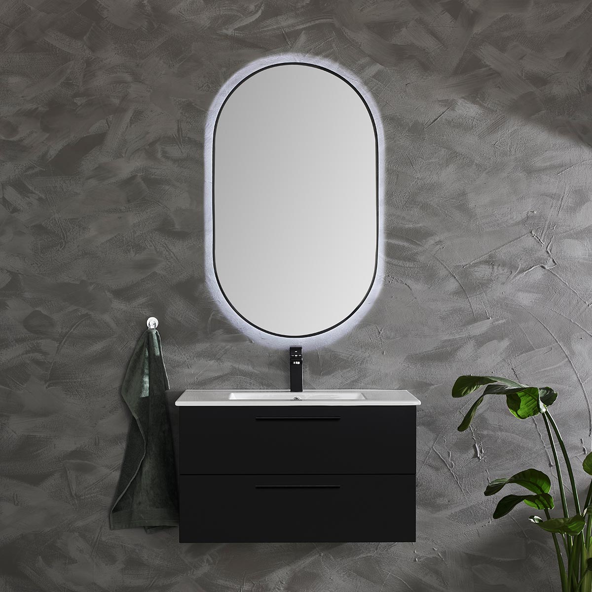 Spegel Bathlife Nöja är en oval spegel med svart ram samt en elegant LED-belysning som belyser väggen bakom spegeln.