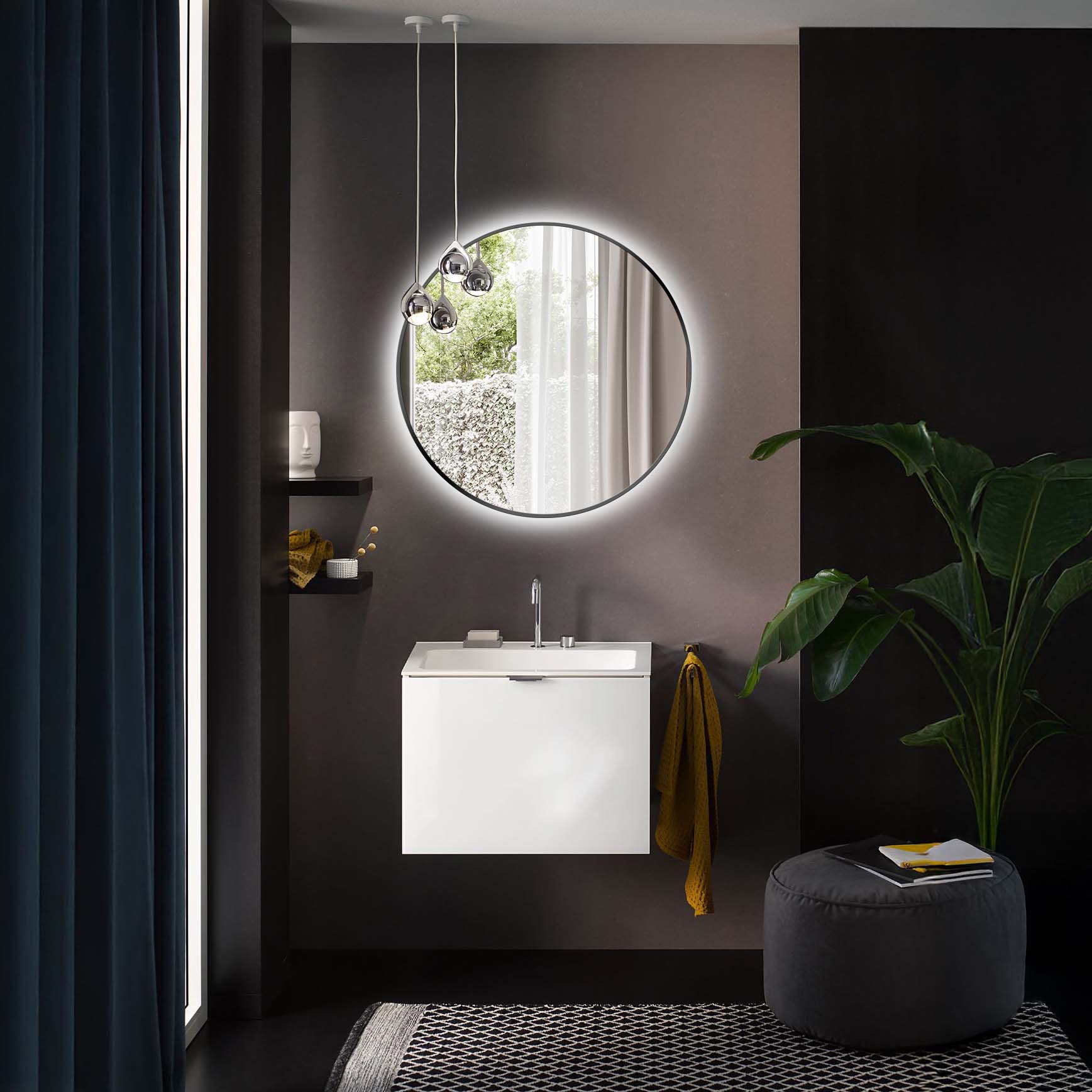 Spegel Bathlife Spira är en rund spegel med svar ram samt en elegant LED-belysning som belyser väggen bakom spegeln. Spegeln finns i fyra storlekar 600,800,1000 och 1200.