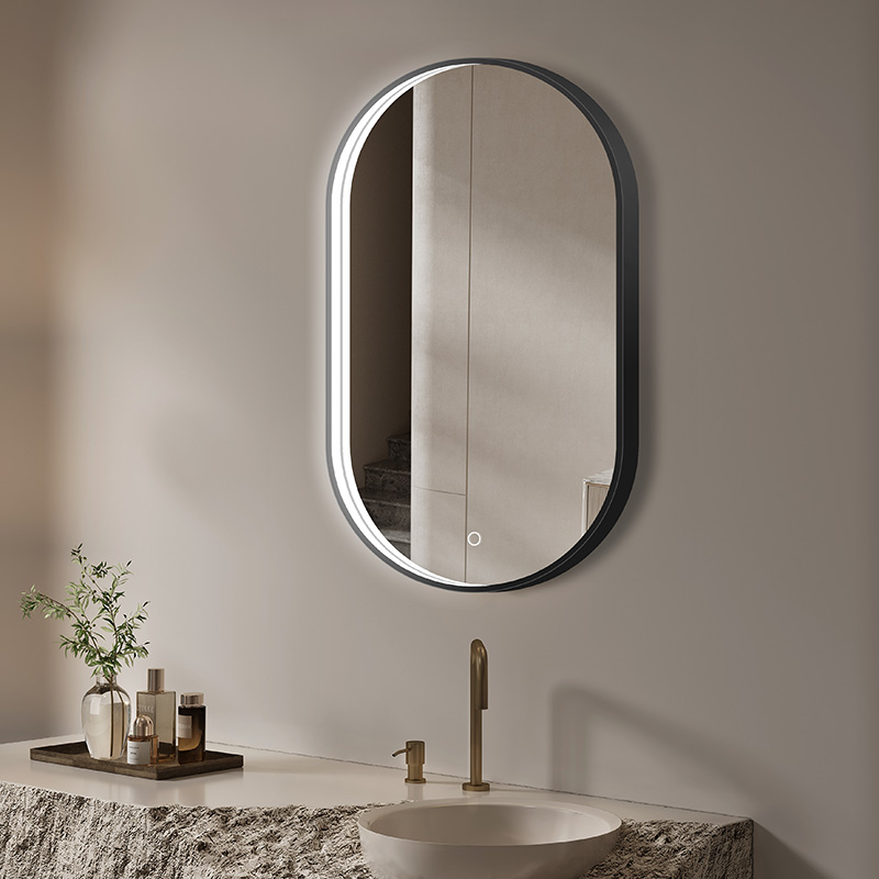 Spegel Bathlife Lysa Oval är en elegant rundad spegel med svart ram och belysning på insidan av ramen som ger ljus mot ansiktet. Ljusfärgen regleras steglöst från varmt till kallt med en touchfunktion. Justerbara upphängningsbeslag. Ej dimbar, IP44.