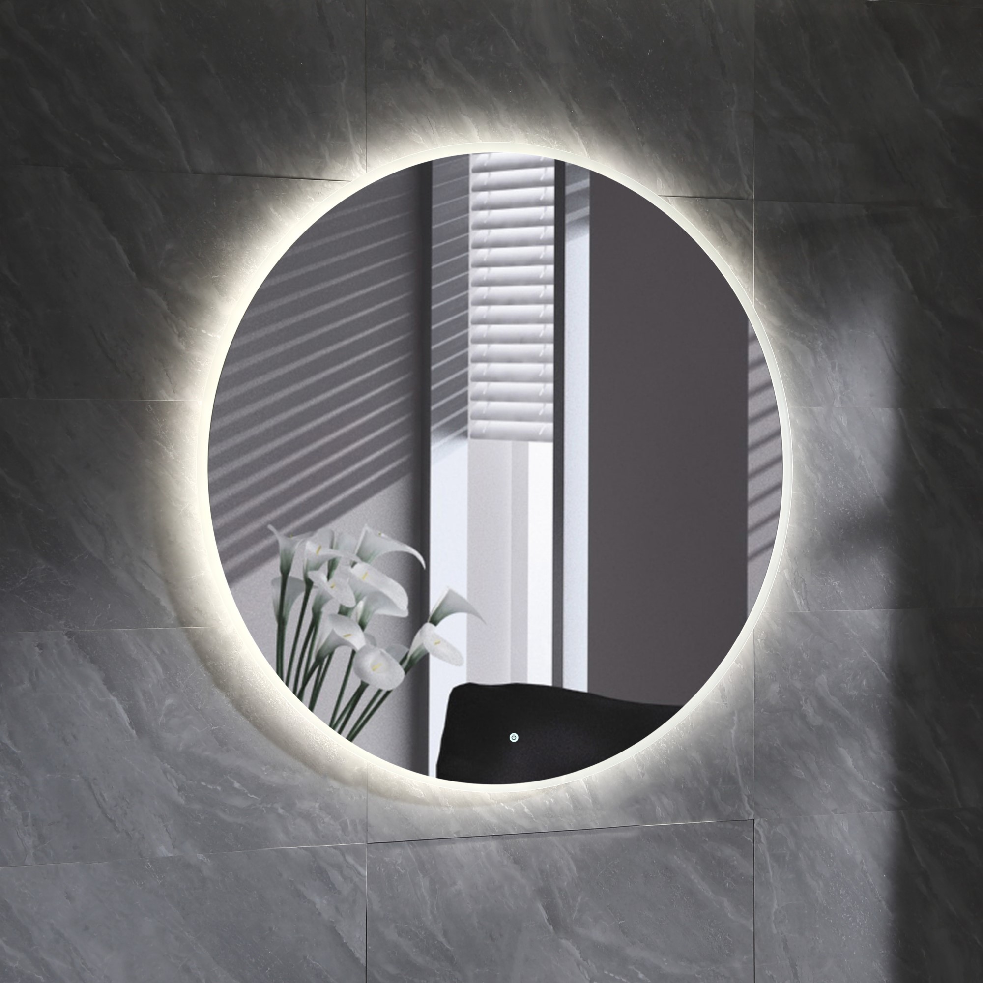 Spegel Bathlife Skina är en rund spegel med en elegant LED-belysning som belyser väggen bakom spegeln. Belysningen har ett normalvitt ljus. Spänning: 220-240 V.
