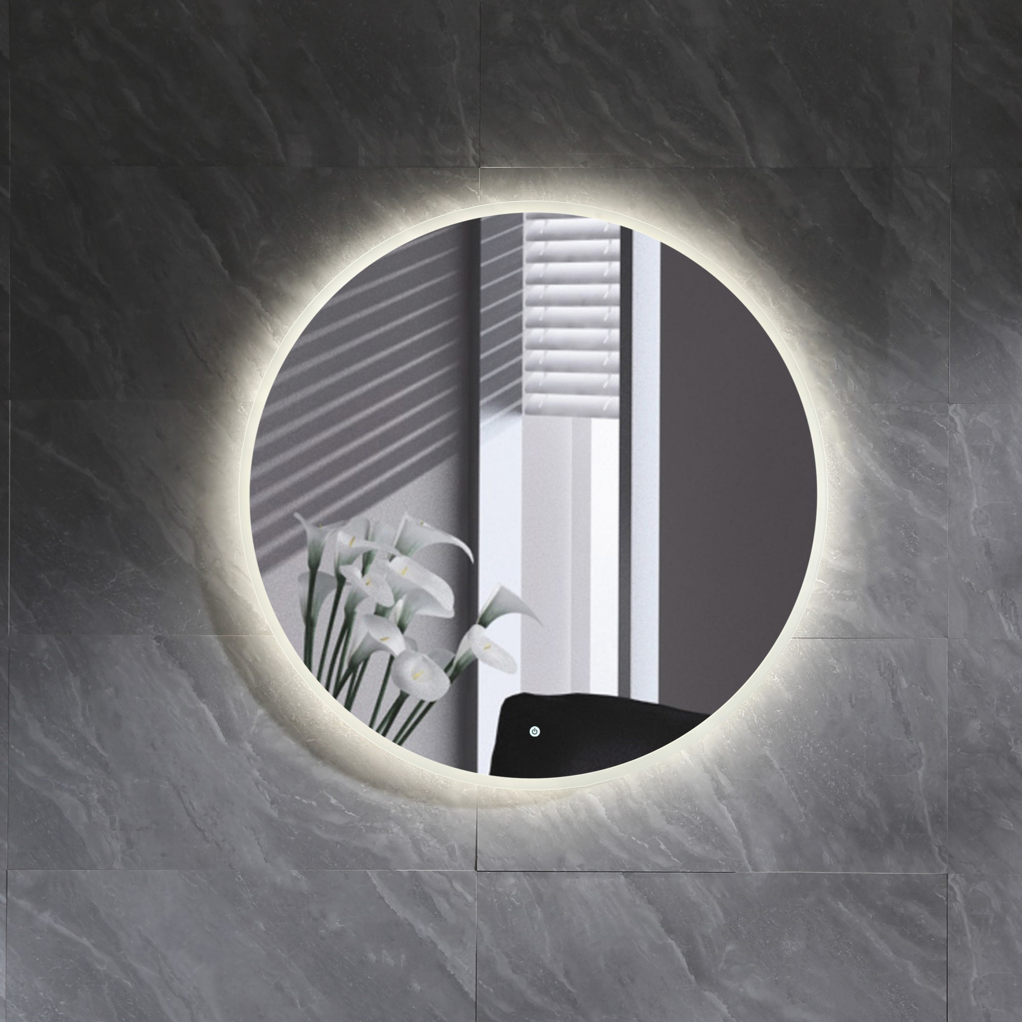 Spegel Bathlife Skina är en rund spegel med en elegant LED-belysning som belyser väggen bakom spegeln. Belysningen har ett normalvitt ljus. Spänning: 220-240 V.