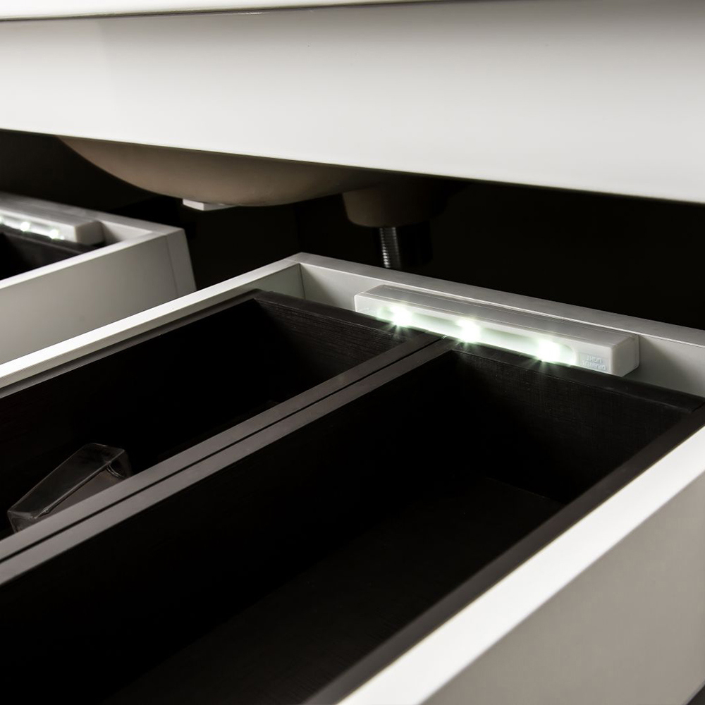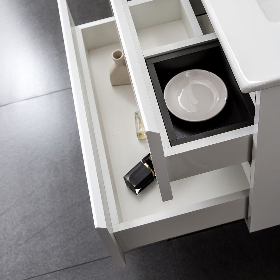 Övre kanten på luckan är snedställd för att lådorna ska vara lätta att öppna. Tvättställsskåp Eufori finns i flera olika bredder.
