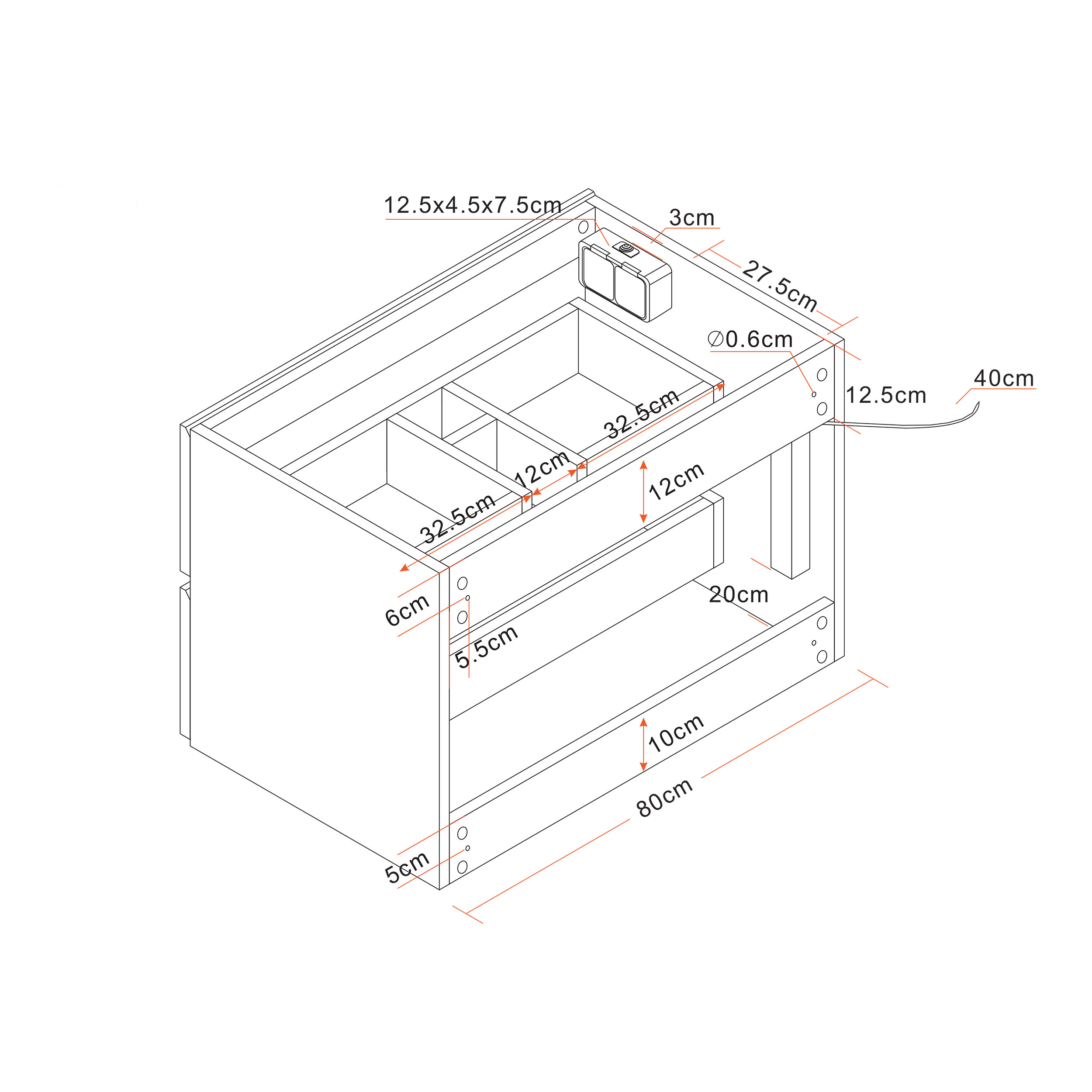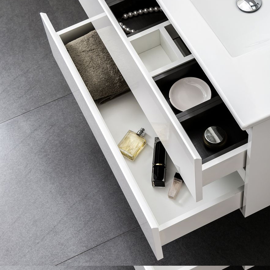Övre kanten på luckan är snedställd för att lådorna ska vara lätta att öppna. Tvättställsskåp Eufori finns i flera olika bredder.