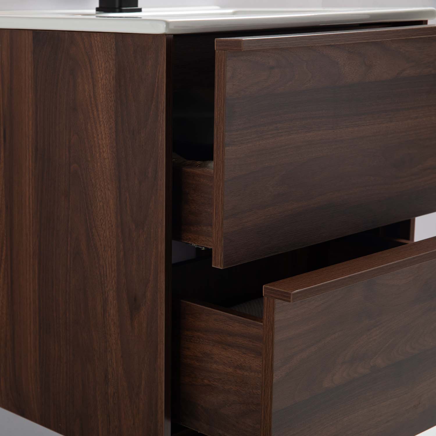 Tvättställsskåp Bathlife Charm med tvättställ är en modern och elegant kommod med fina detaljer som tunn ram runtom, integrerade grepplister på de mjukstängande lådorna och vackert trämönstrad yta. Skåpet är tillverkat av melaminbelagd MDF och det medföljande tvättstället är av vitt porslin. Skåpet ger bra med förvaring i de två lådorna som är mjukstängande. Levereras färdigmonterad inklusive porslinstvättställ. Köp till bottenventil, tvättställsblandare och avloppssats. Den här produkten har utvecklats i Sverige av Bathlife, med mål att leverera en prisvärd, kvalitativ produkt du kan lita på och njuta av under lång tid.