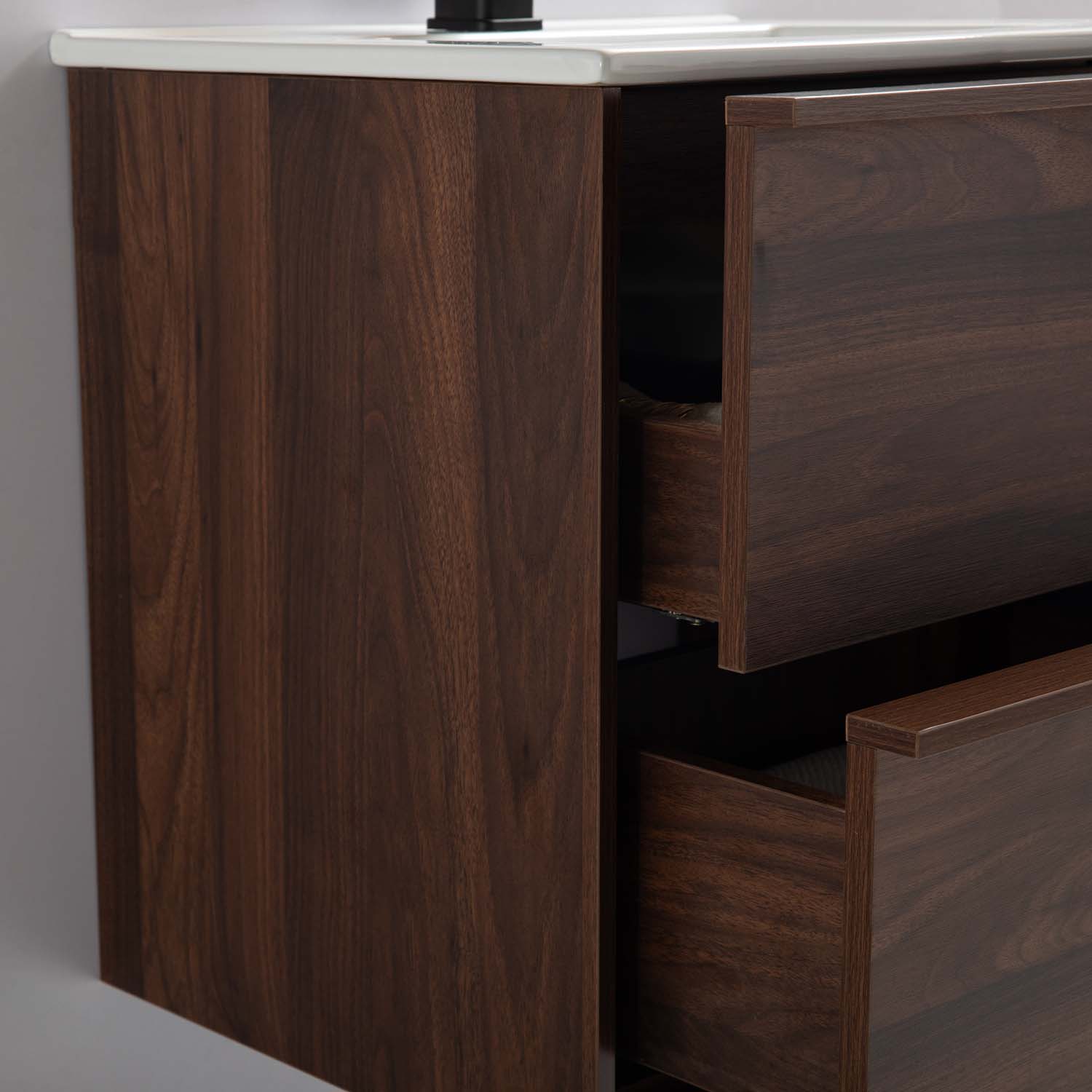 Tvättställsskåp Bathlife Charm med tvättställ är en modern och elegant kommod med fina detaljer som tunn ram runtom, integrerade grepplister på de mjukstängande lådorna och vackert trämönstrad yta. Skåpet är tillverkat av melaminbelagd MDF och det medföljande tvättstället är av vitt porslin. Skåpet ger bra med förvaring i de två lådorna som är mjukstängande. Levereras färdigmonterad inklusive porslinstvättställ. Köp till bottenventil, tvättställsblandare och avloppssats. Den här produkten har utvecklats i Sverige av Bathlife, med mål att leverera en prisvärd, kvalitativ produkt du kan lita på och njuta av under lång tid.