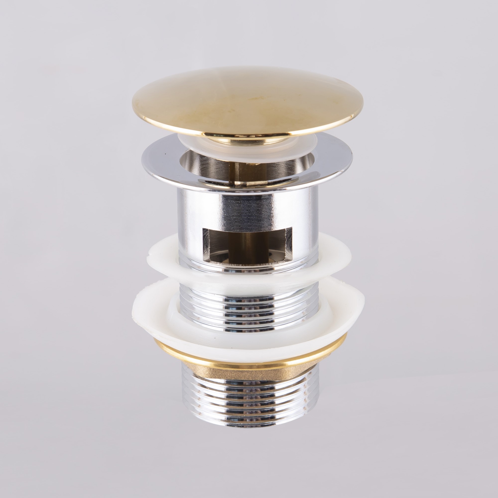 Bottenventil Bathlife med bräddavlopp har ett lock med fjädring. Bottenventilen öppnas och stängs genom att trycka ner locket.