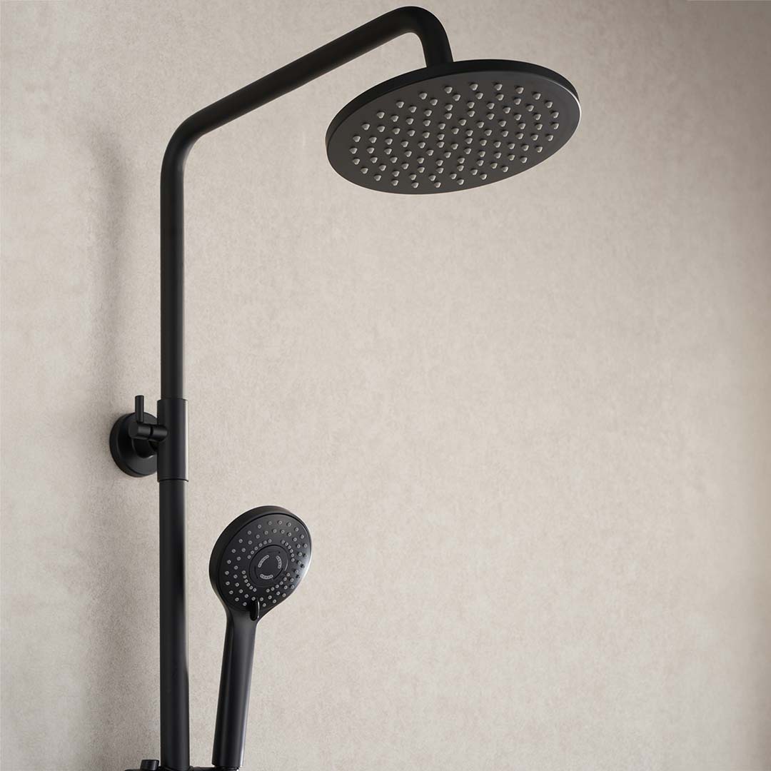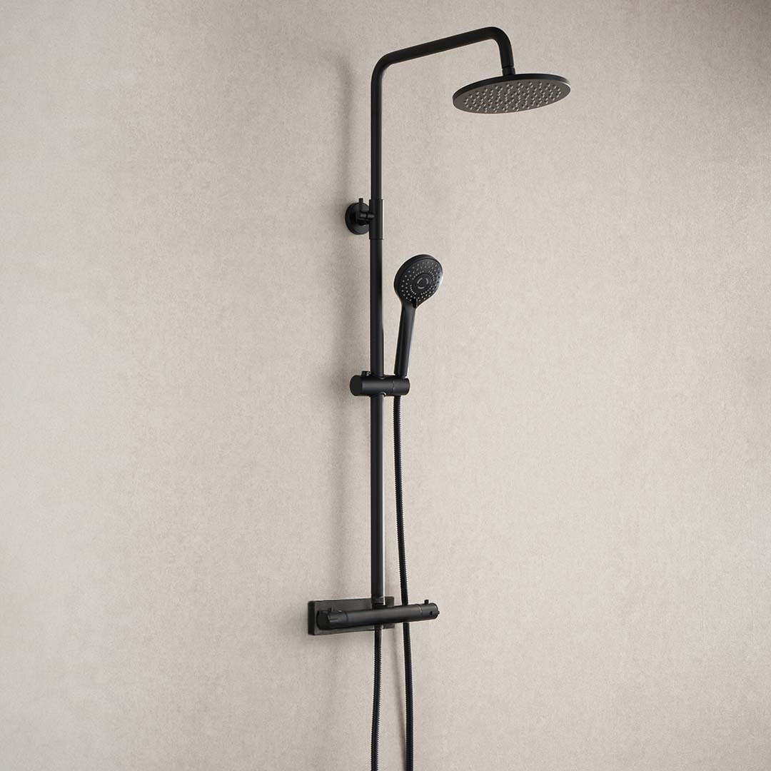 Bathlife takduschset Glimma är ett komplett set med termostatblandare, justerbar duschstång, taktallrik Ø 200mm och handdusch med tre funktioner. Glimma har en fin design som passar alla typer av badrum. CC 160 mm .