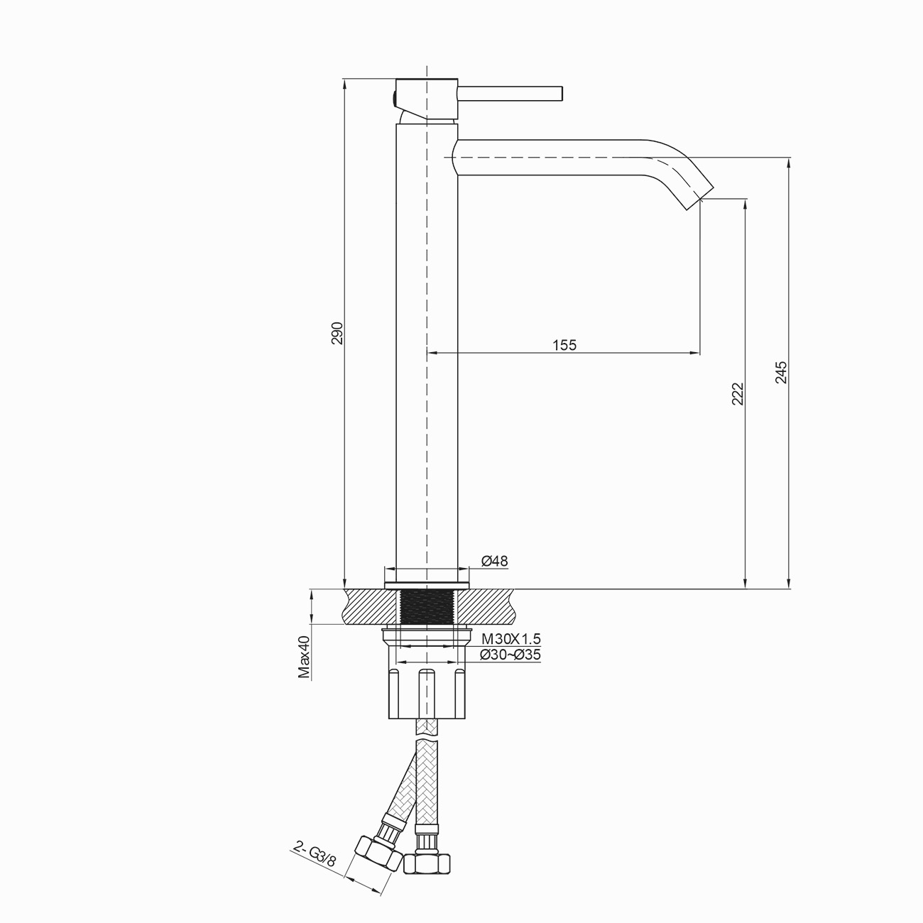 - Håldiameter för montering i tvättställ eller bänkskiva, 30–35 mm