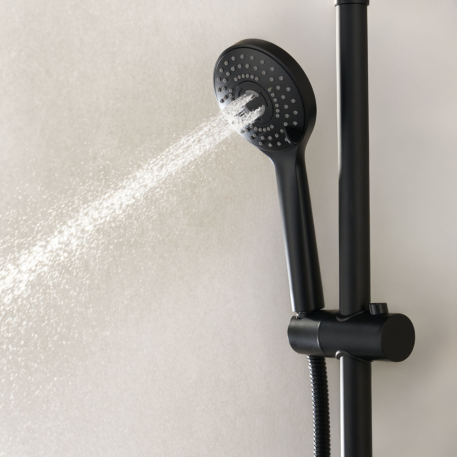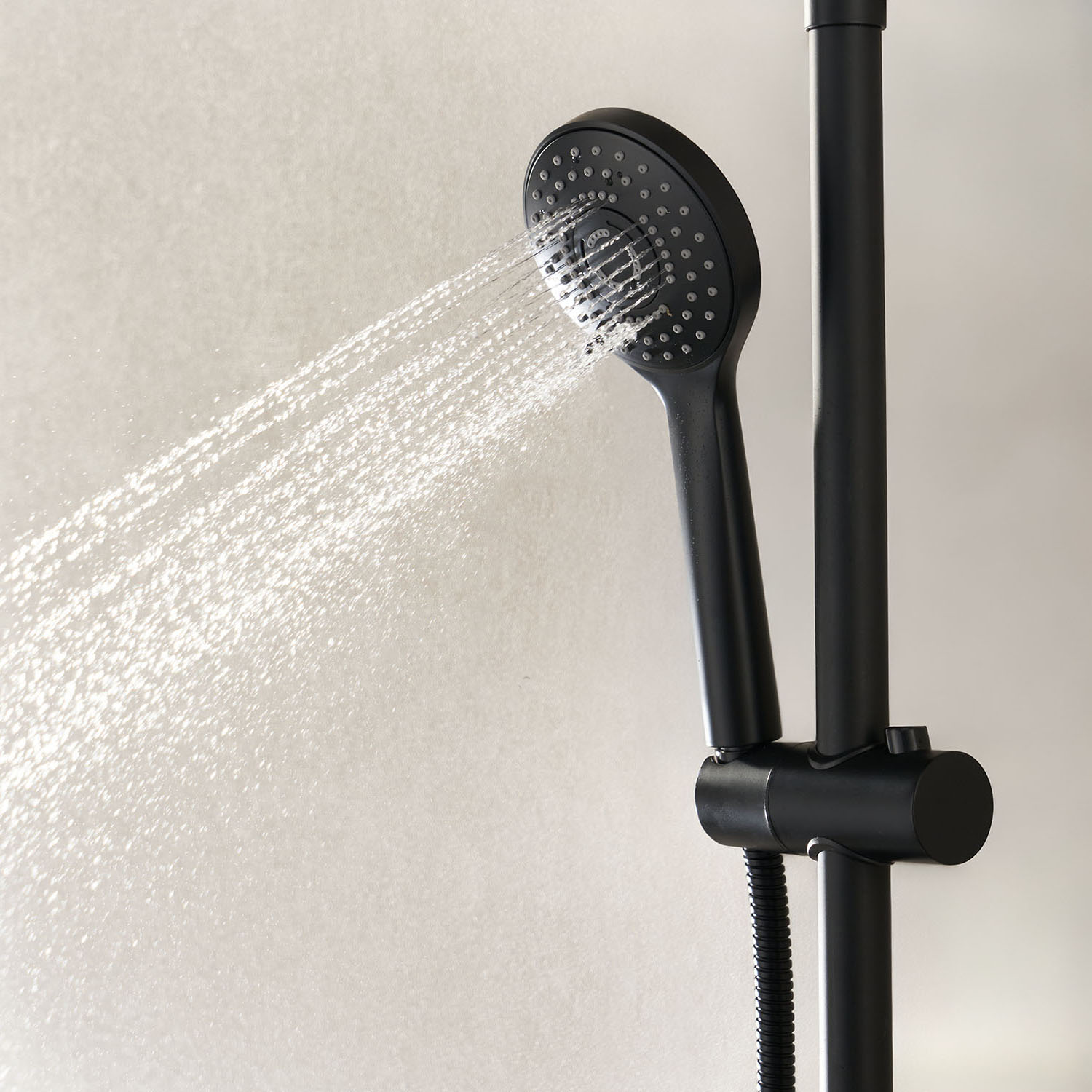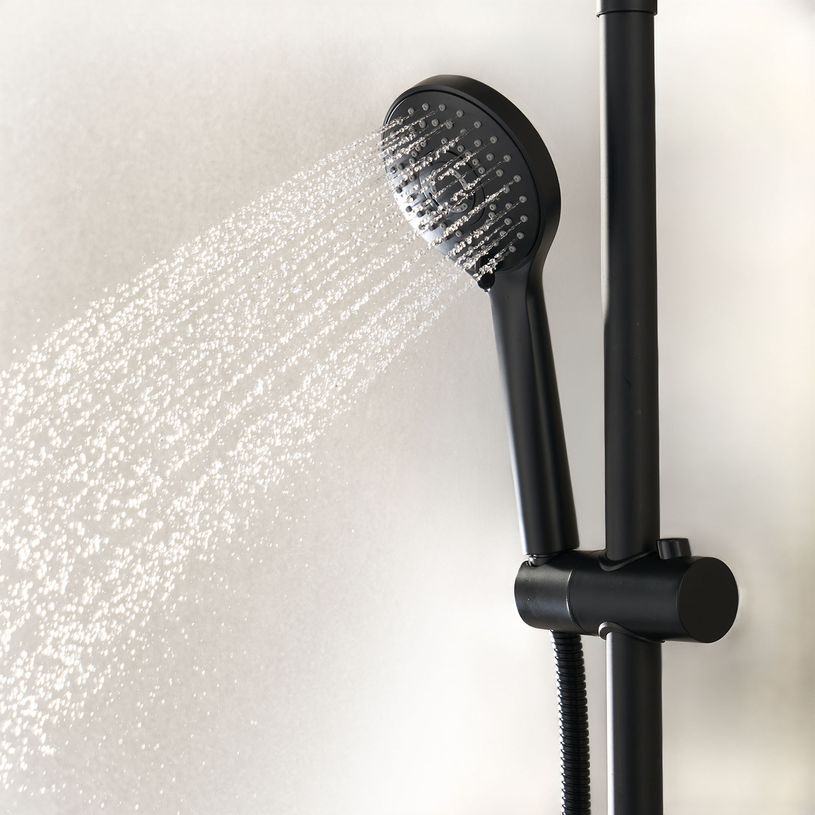 Handduschen har tre ståltyper för optimal komfort. Den bakre glasväggen har excentriska hål för montering av duschblandare med cc-mått 150 på den kortaste av duschkbabinens två baksidor. Köp till duschblandare och kopplingar.