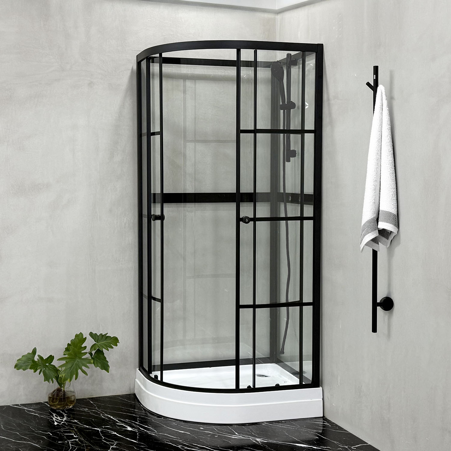 Duschkabin Bathlife Betrakta Rund är en prisvärd och stilren duschkabin med hörningång. Kabinen är utrustad med härdat säkerhetsglas, ett duschset och ett stabilt kar i vit akryl med avtagbar front, bottenventil samt avloppsslang.